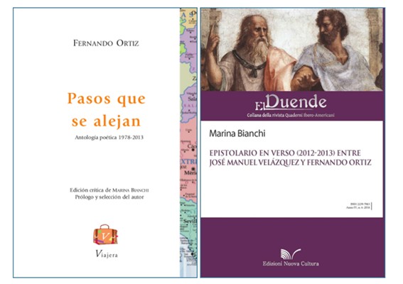 Tuvo Ortiz una perfecta editora en Marina Bianchi, profesora de la Universidad de Bergamo. Su introducción a Pasos que se alejan es modelo de erudición y discernimiento nunca nublados por la evidente bienquerencia. Iguales méritos aparecen en el otro libro de la Profesora Bianchi que acaba de publicarse, Epistolario en verso (2012-2013) entre José Manuel Velázquez y Fernando Ortiz. En ambos ensayos aborda el interesante itinerario poético de Ortiz. Resalta la importancia del tiempo como centro de gravedad de toda su obra, pero observa que «en los primeros libros, hasta El verano de 1992, prima la nostalgia, la soledad, la tristeza y las anécdotas negativas». Más tarde, «desde Moneditas de 1996 algo cambia». Irrumpe el humor, a veces tierno y con frecuencia irónico. Tiene razón, aunque a veces nos olvidemos de esta última faceta de Ortiz. Valga esta soleá como botón de muestra: