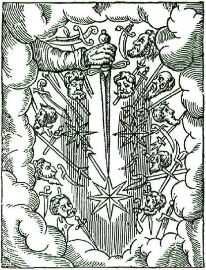 «Los antiguos -escribe Parénos dejaron escrito que la faz del cielo se ha visto muchas veces desfigurada por cometas barbudos y de largos cabellos… La antigüedad -dice Pierre Boaisluau en una de sus [ed, Richard A. Carr, París, Champion, 1977], utilizando como fuente el Prodigiorum ac ostentorum chronicon de Conrado Licóstenes [Basilea, 1557]- no conoció en los aires nada más prodigioso que el horrible cometa de color sangre que apareció en Westrie el 9 de octubre de 1528. Este cometa produjo en el pueblo tan gran terror, que algunos murieron de pánico y otros cayeron enfermos. La visión de este extraño cuerpo celeste duró una hora y cuarto, y comenzó a mostrarse por el lado del sol naciente hacia el mediodía. Parecía ser de descomunal longitud y era, efectivamente, de un color rojo similar al de la sangre. En su parte superior se veía la figura de un brazo doblado que sujetaba en la mano una gran espada, en actitud de herir con ella. En el extremo de la espada había tres estrellas; la que estaba justamente en la punta era más clara y reluciente que las otras. A ambos lados de los rayos del cometa se veía gran número de hachas, cuchillos y espadas teñidas de sangre entre las que había gran número de rostros humanos repulsivos, con las barbas y los cabellos erizados, tal y como lo veis en el grabado [figura 1]. Después de la pasión de Jesucristo, la destrucción de la ciudad de Jerusalén fue anunciada por varios signos, entre ellos uno espantoso en forma de espada de fuego reluciente [figura 2], que apareció por espacio de un año encima del templo, como mostrando que la cólera divina quería vengarse del pueblo judío mediante el fuego, la sangre y el hambre. Y tal ocurrió, pues sobrevino una hambruna tan calamitosa, que las madres se comieron a sus propios hijos. Y luego la ciudad fue destruida por los romanos».