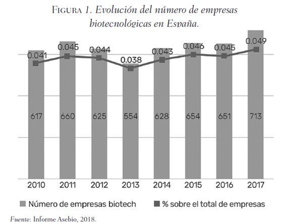 Aunque el sector biotecnológico español es relativamente reciente, se ha consolidado y crecido de manera continuada durante las últimas décadas pese a la crisis económica. Como se observa en la Figura 1, el número de empresas ha crecido durante los últimos años, a excepción del año 2013, contabilizándose en 2017 un total de 713 empresas.