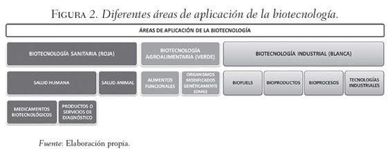 La biotecnología puede aplicarse a diferentes áreas industriales, y en base a ello, podemos diferenciar tres tipos de biotecnología: la biotecnología roja o sanitaria, la biotecnología verde o agroalimentaria y la biotecnología blanca o industrial.